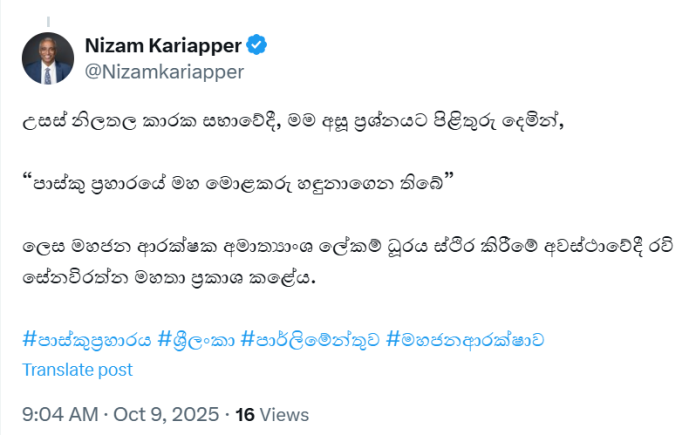 ඒ පිළිබඳව පාර්ලිමේන්තු මන්ත්රී නිසාම් කාරියප්පර් සිය සමාජ මාධ්ය ගිණුමෙහි තබා තිබූ සටහන පහතින්.