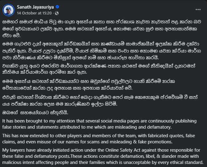 ඇතැම් සමාජ මාධ්ය පිටු තමා ගැන විවිධ අසත්ය ප්රකාශ නැවතත් පළ කරමින් පවතින බව ශ්රී ලංකා ජාතික ක්රිකට් කණ්ඩායමේ පුහුණුකරු සනත් ජයසූරිය පවසනවා.