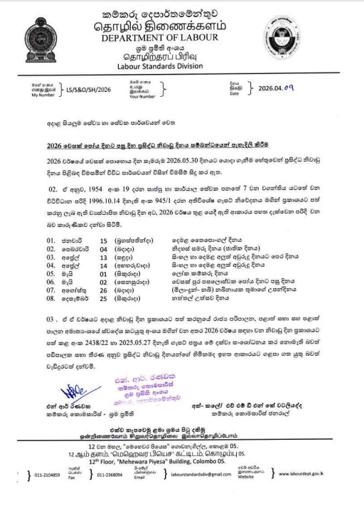 එම දෙපාර්තමේන්තුව මේ බව සඳහන් කළේ, 2026 වෙසක් පෝය දිනට පසු දින ප්‍රසිද්ධ නිවාඩු දිනය සම්බන්ධයෙන් පැහැදිලි කිරීමක් සිදු කරමිනි.