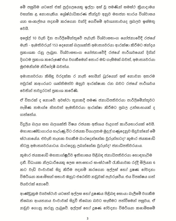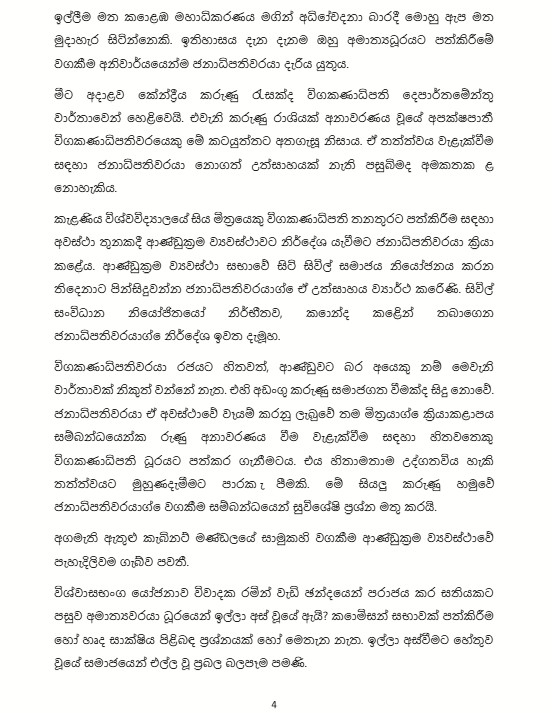 කෙසේ නමුත් ජනාධිපති කොමිසමක වැඩ කටයුතු සඳහා අමාත්යවරයෙකුගේ ඉල්ලා අස්වීම කිසිසේත් බල නොපාන බවත් එය ව්යාජ හේතුවක් බවත් ඒකාබද්ධ විපක්ෂය අදාළ ලිපිය මගින් සඳහන් කර තිබේ.
