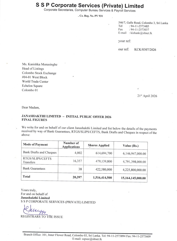 ජනශක්ති ලිමිටඩ් විසින් පසුගියා දා විවෘත කරන ලද මූලික මහජන කොටස් නිකුතුව සඳහා ඊට ඉදිරිපත් කළ ප්රමාණය මෙන් තුන්ගුණයකට වැඩි කොටස් ප්රමාණයක් සඳහා අයදුම්පත් කර තිබෙන බව අදාළ නිකුතුවේ රෙජිස්ට්රාර් සමාගම වන S S P CORPORATE SERVICES (PRIVATE) LIMITED විසින් දන්වා සිටී.