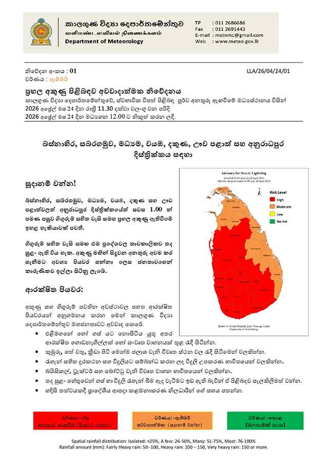 නිවේදනයක් නිකුත් කරමින් එම දෙපාර්තමේන්තුව පැවසුවේ බස්නාහිර, සබරගමුව, මධ්යම, වයඹ, දකුණ සහ ඌව පළාත්වලත් අනුරාධපුර දිස්ත්රික්කයේත් සවස 1.00න් පසුව වැසි සමග ප්රබල අකුණු ඇතිවීමේ හැකියාවක් ඇති බවය.